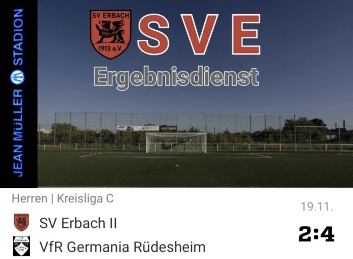 Aufstellung Spielbericht Unsere 2. Mannschaft von Trainer Sebastian Macho unterliegt im Jean-Müller-Stadion gegen den VfR Germania Rüdesheim mit 2:4 (1:2). Bereits nach 13 Minuten lag unser Team mit 0:1 zurück. Sebastian Macho erzielte in der 30. Minute per Elfmeter den Ausgleich. Das Unentschieden hatte dann keine Minute Bestand und in der 31. Minute fiel direkt das 1:2. In der 43. Minute kassierten ein Erbacher und Rüdesheimer je eine zehnminütige Zeitstrafe und es ging in die Pause. In der zweiten Hälfte glänzten erstal die Rüdesheimer. In der 60. Minute gelang das 1:3 und gute 10 Minuten später sogar das 1:4. Unser SVE kämpfte trotzdem weiter und in der 78. Minute erzielte Nick Woscidlo noch das 2:4, aber danach verteidigte der VfR alles weg und gewinnt am Ende klar und auch verdient mit 2:4. Torschützen Spielverlauf Aufstellung Quelle „Aufstellung“, „Torschützen“ und „Spielverlauf“: FUSSBALL.DE